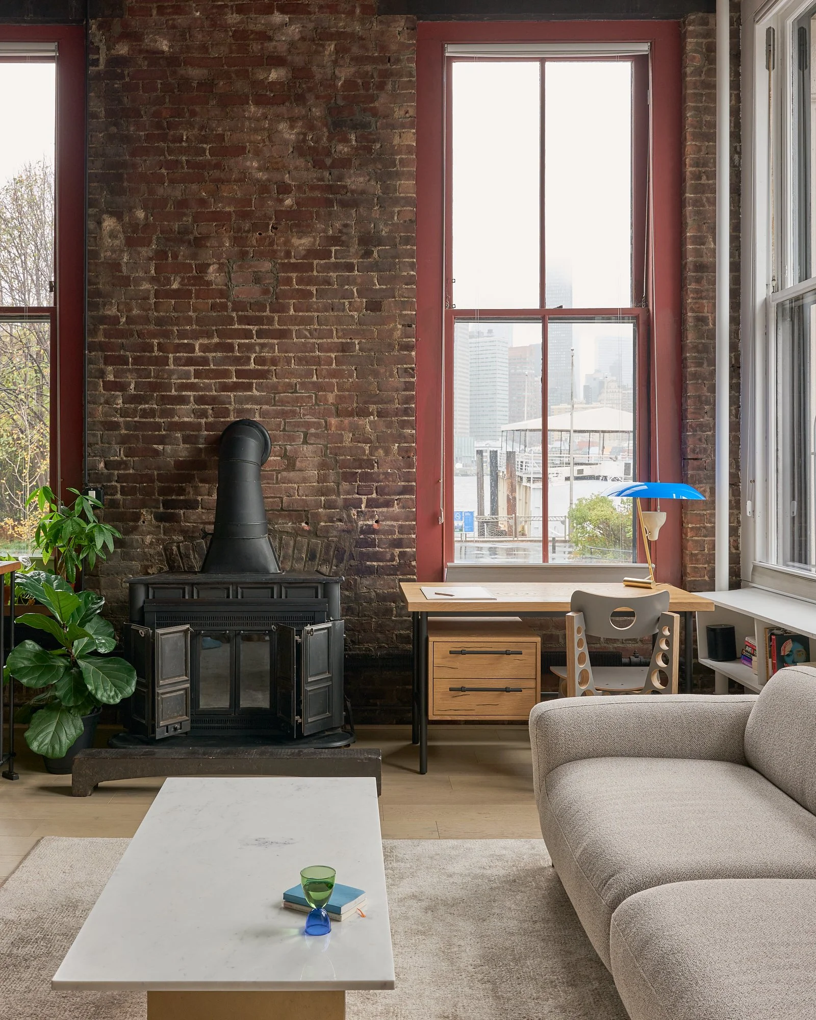 In a historic building at the base of the Brooklyn Bridge, this home has lovely architectural features kept and incorporated into the design such as the ornate cast iron columns and exposed wood joists.
