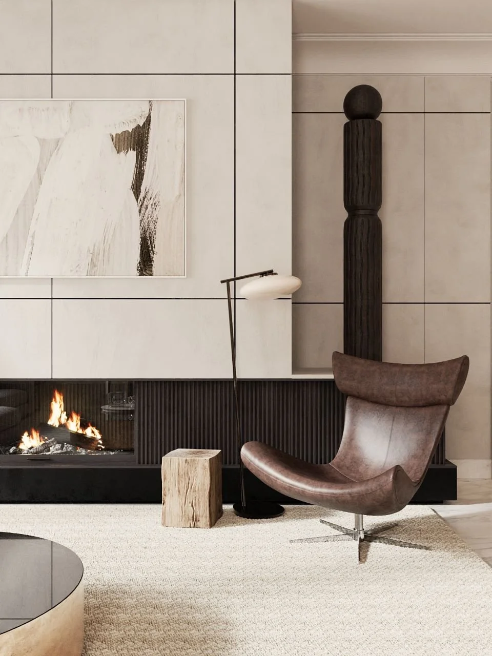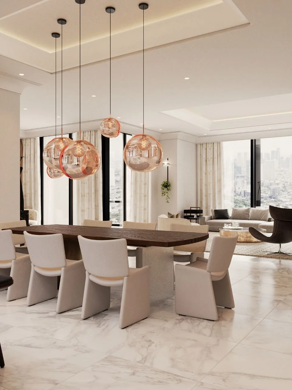 The living area is anchored by a custom-built feature wall housing both a fireplace and art niche — a sculptural centerpiece designed for conversation and warmth. In the dining room, Tom Dixon pendants float above a solid wood table, casting a copper glow across the marble floors.