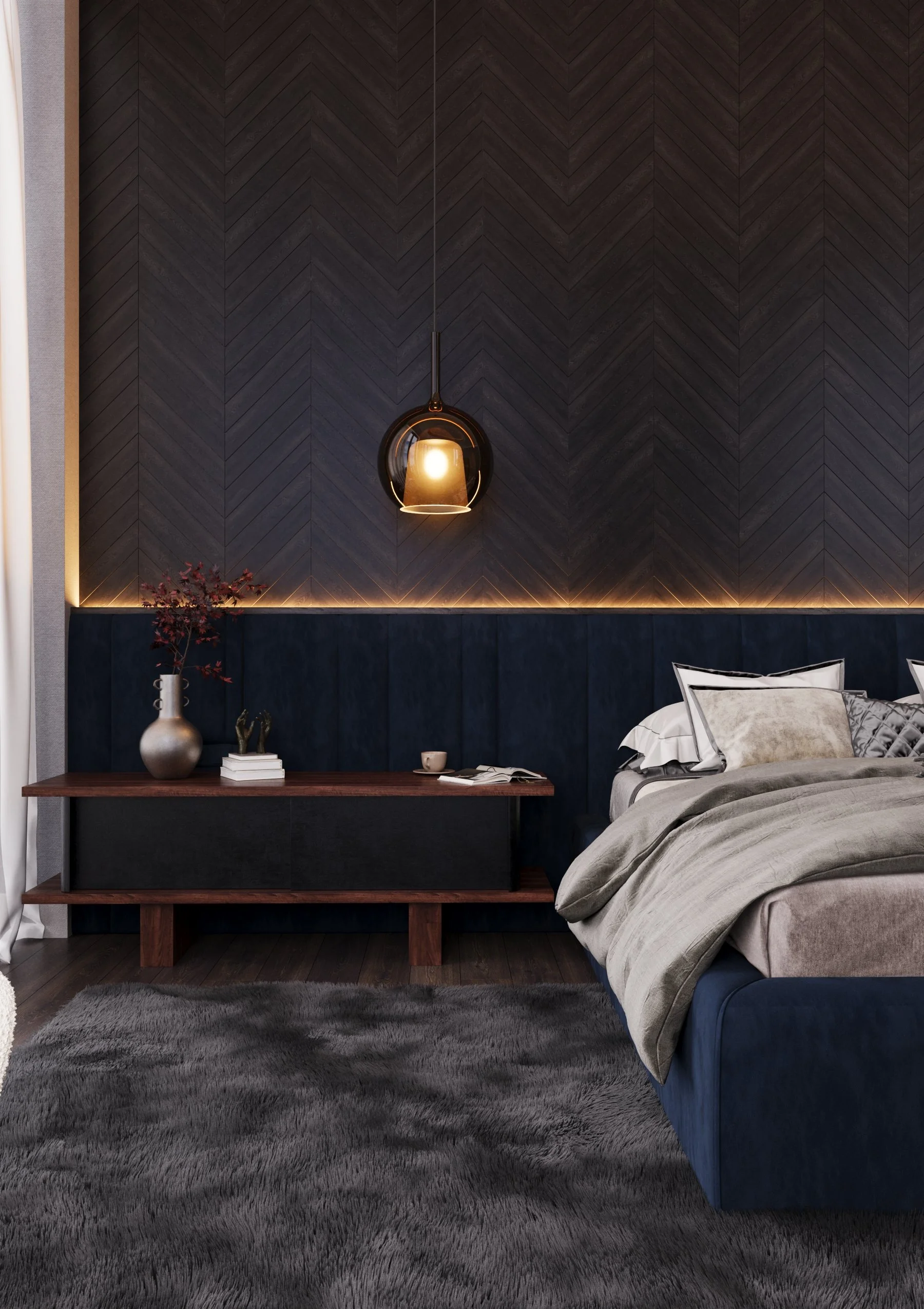 The master suite introduces moody refinement with a handmade chevron feature wall, custom bed, and Hästens mattress, infusing the space with quiet luxury and New York City attitude. Every detail was crafted to feel timeless, tactile, and deeply personal — a reflection of refined urban living elevated for Jakarta’s skyline.